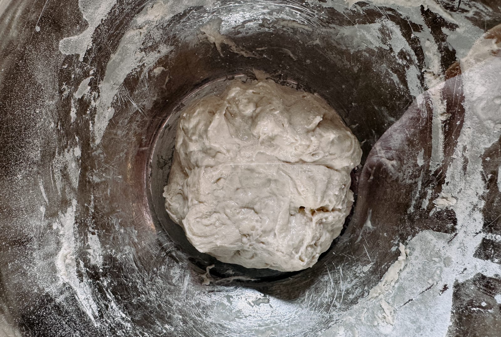 - Wipe the entirety of the bowl above the dough by hand with olive oil, just enough to prevent sticking but again, not excessively so that it pools at the contact point where the dough touches the wall of the bowl.
