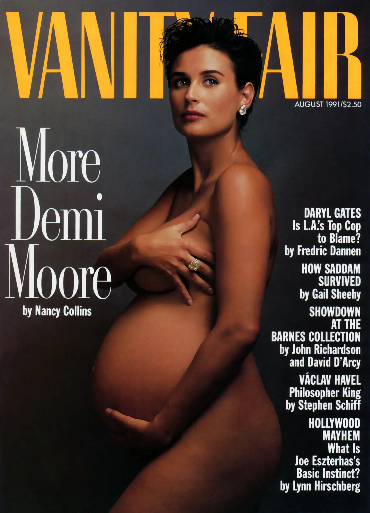 Demi Moore, shot by Annie Leibovitz on the 1991 cover of Vanity Fair created widespread controversy. It polarised opinion for challenging societal taboos and for the depiction of pregnancy and nudity. It feels relatively innocuous by today's cultural perceptions, but it drew substantial media commentary. Interestingly, Moore was five years younger in the photograph than the daughter she was carrying is today.