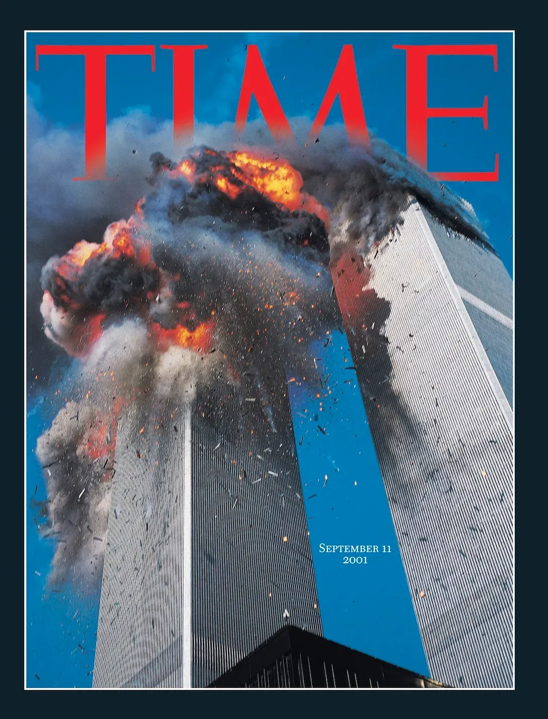 Time Magazine - 11/September 2001. Canadian photographer Lyle Owerko's image is the synthesis of all that happened that day. For a magazine like Time, the choice of images would have been substantial, and sometimes, a neutral and sobering act of witness is all that is needed. Even the masthead is symbolically staged behind the all encompassing horror of that image. It remains one of the most iconic images of that moment in history and sits with Thomas Hoepker's image which required the distance that only time can bring to reflect on.