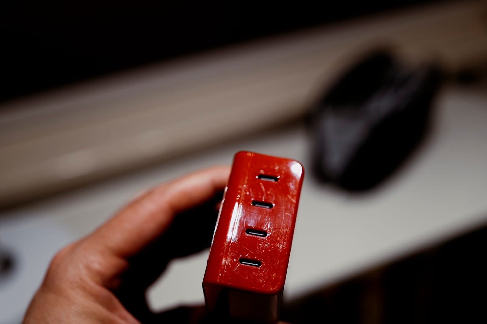 The slim profile and downward facing port design is thoughtful and considered design. It solves the problem of cable bend radius and reduces the risk of twisting stress and damage to the cable by allowing it to fall naturally. Most cables do tend to offer some degree of support - usually visible as a thicker collar before the USB-C plug but you're still putting the termination at the connector under a degree of loading. I suspect if you were to trip over a connected cable, you'd severely damage the cable - most equivalent products would see the cable pull out of the socket laterally due to the placement of the sockets.