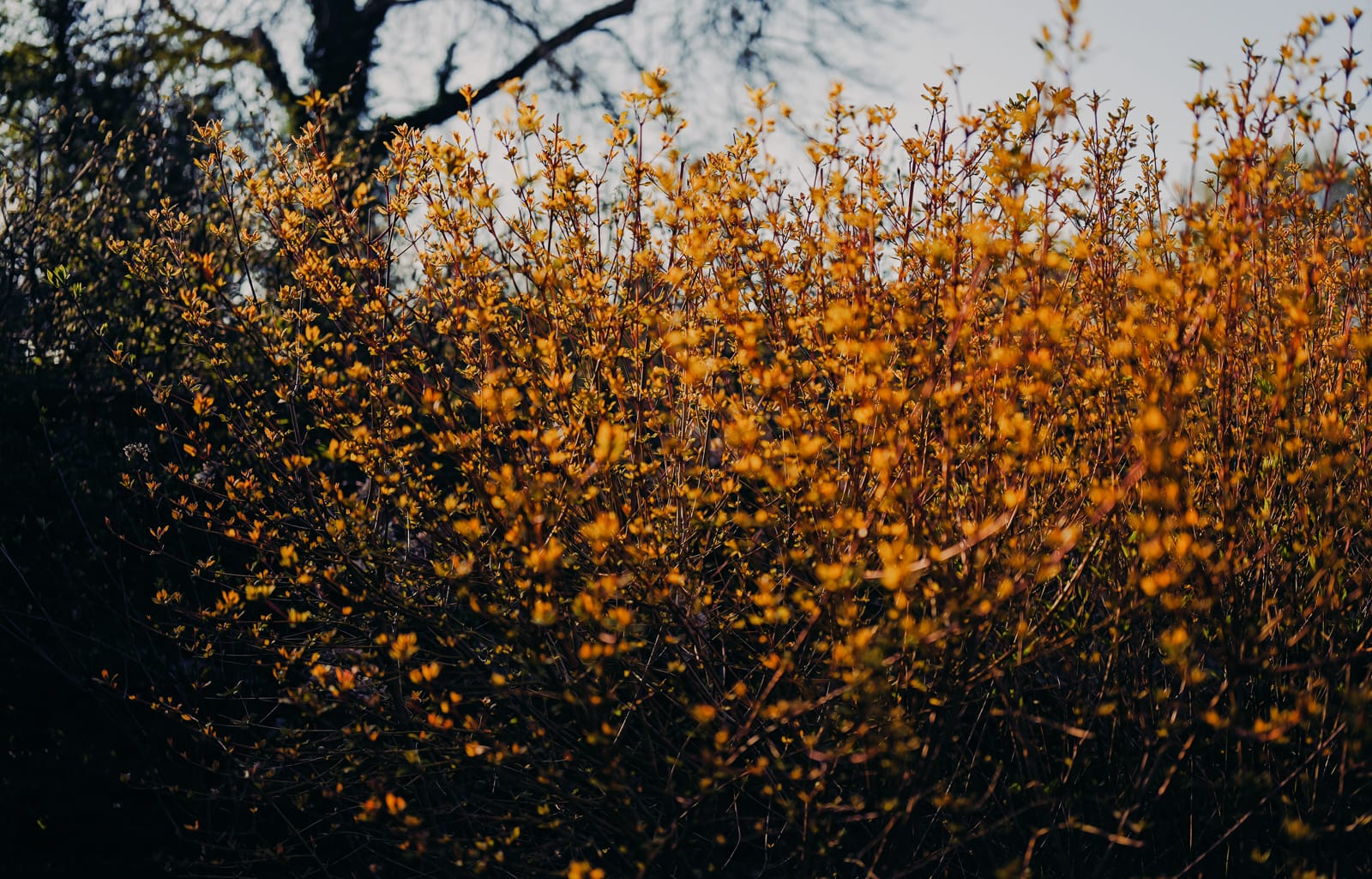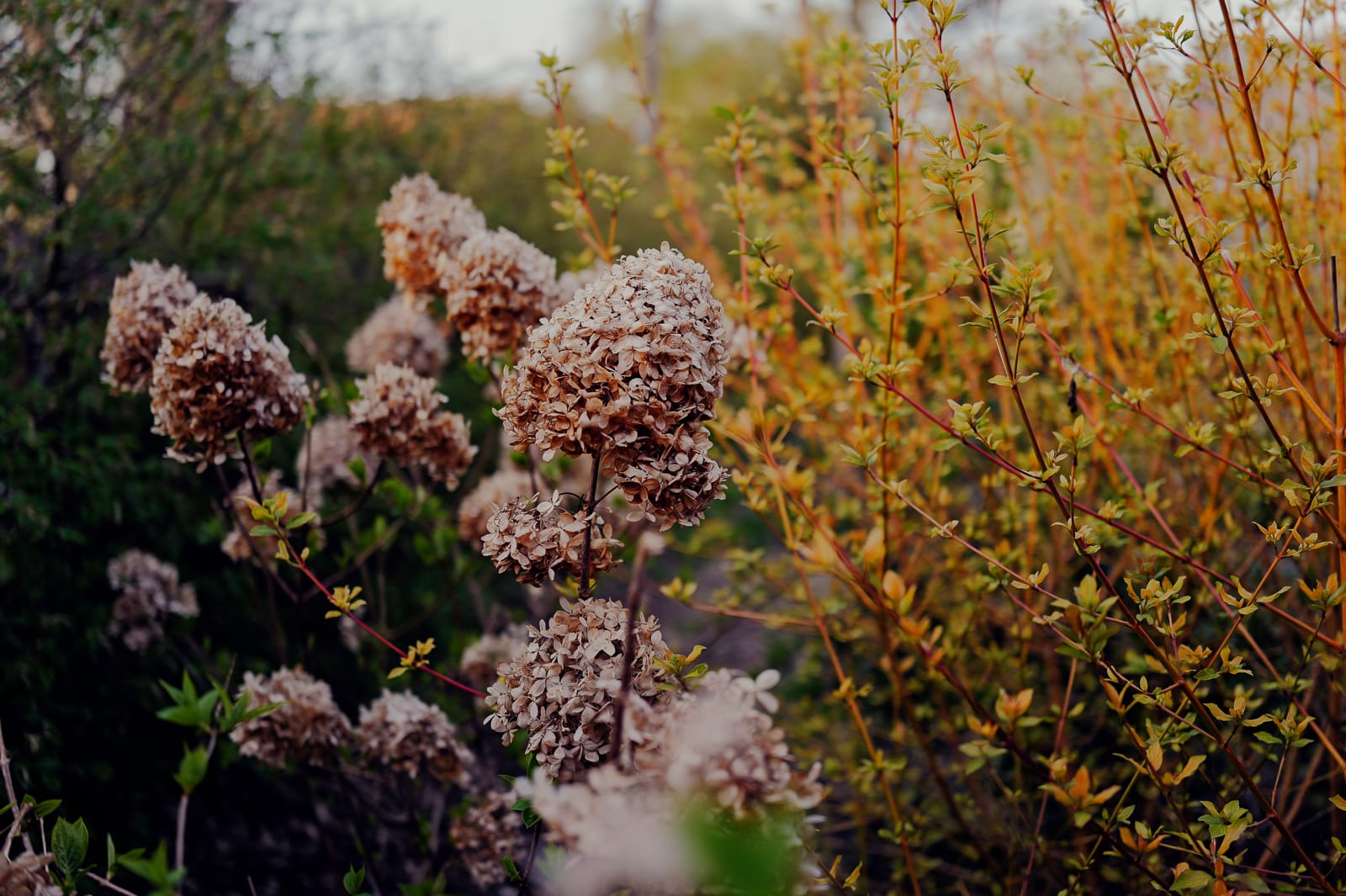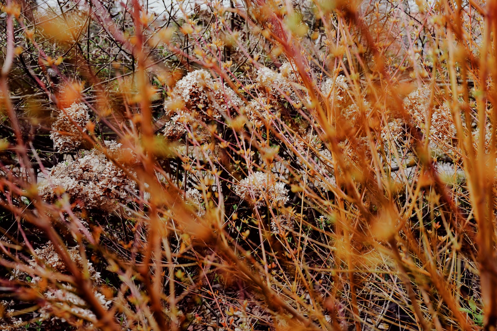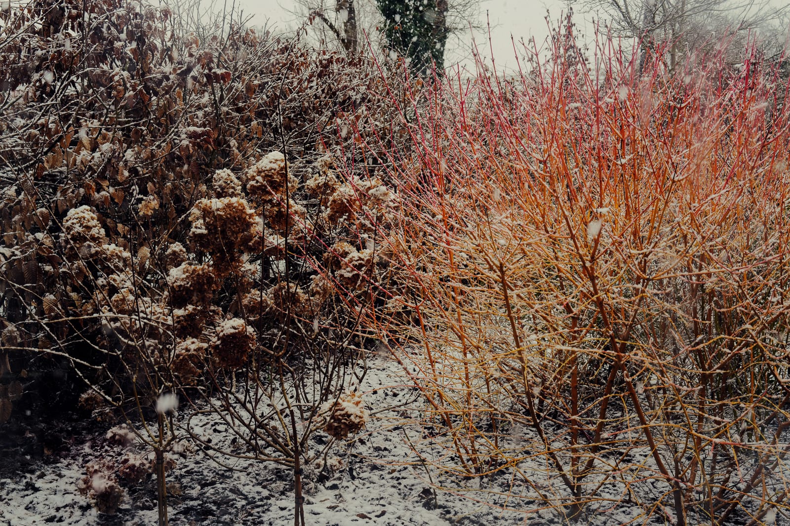 Common Hornbeam (Carpinus betulus), Hydrangea paniculata 'Limelight', Cornus sanguinea 'Midwinter Fire', Broad-leaved cockspur thorn (Crataegus x prunifolia), Darwin's Barberry (Berberis darwinii)